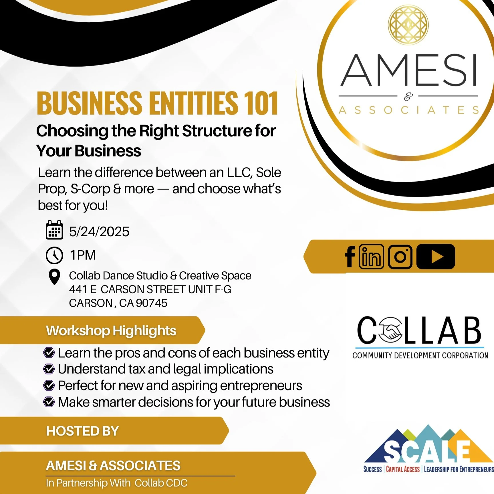 May 24 Business Entity Formation 101 w/ Amesi & Associates Saturday, May 24, 2025 1:00 PM 3:00 PM COLLAB Dance Studio & Creative Space (map) Google Calendar ICS Click the Register View Event →