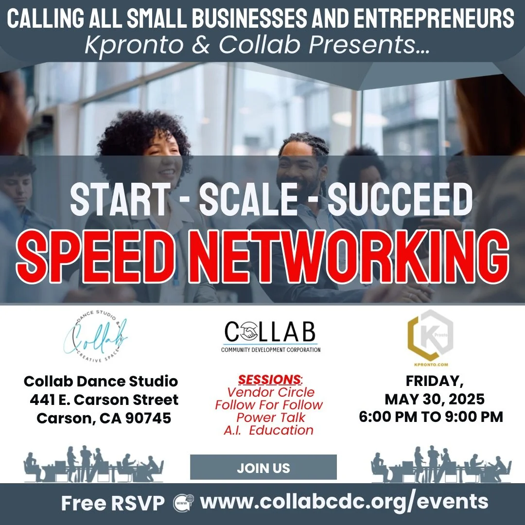 May 30 Speed Networking Mixer Friday, May 30, 2025 6:00 PM 9:00 PM COLLAB Dance Studio & Creative Space (map) Google Calendar ICS Click here for free RSVP View Event →