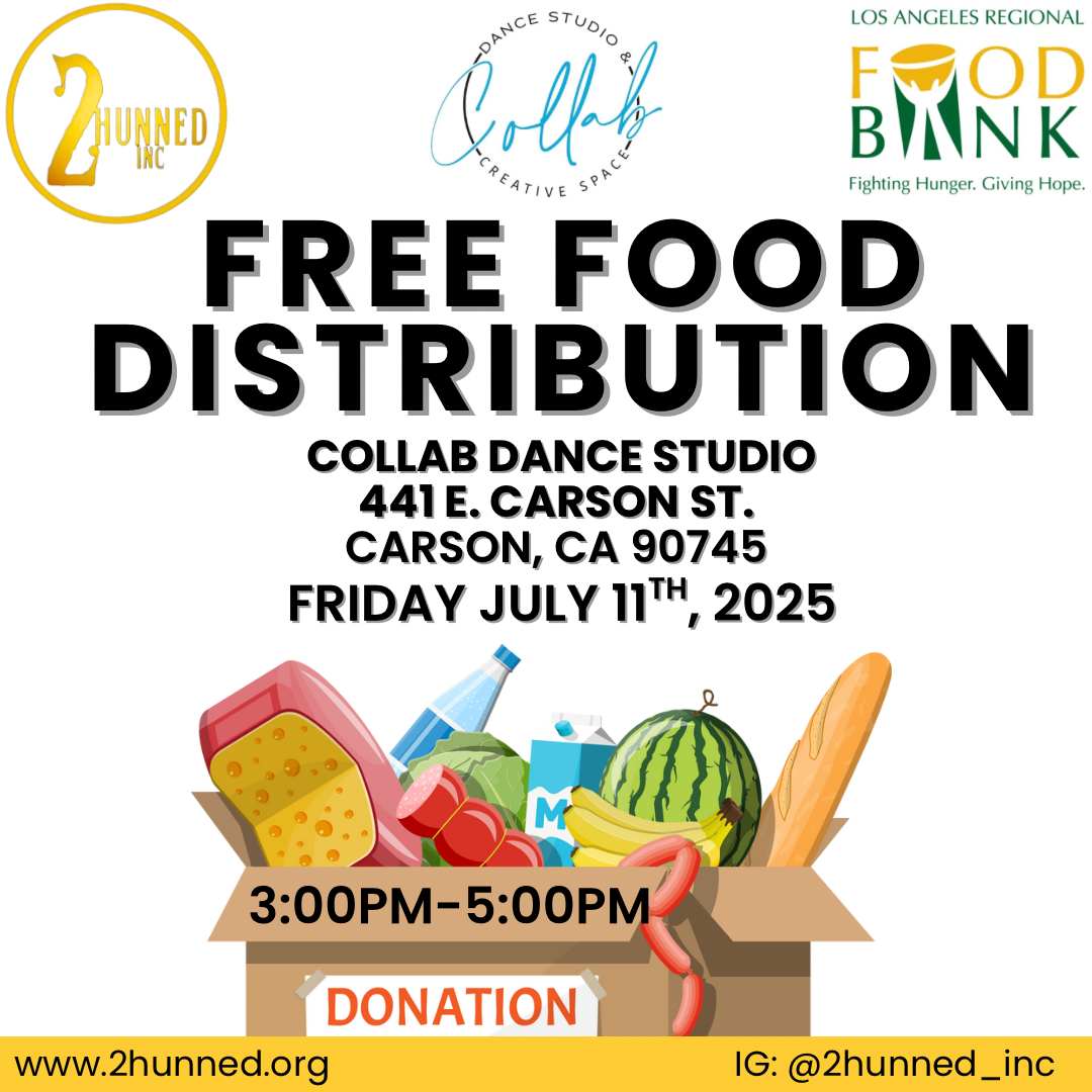 Jul 11 Free Food Distribution with 2hunned Friday, July 11, 2025 3:00 PM 5:00 PM COLLAB Dance Studio & Creative Space (map) Google Calendar ICS Drive or Walk Up View Event →