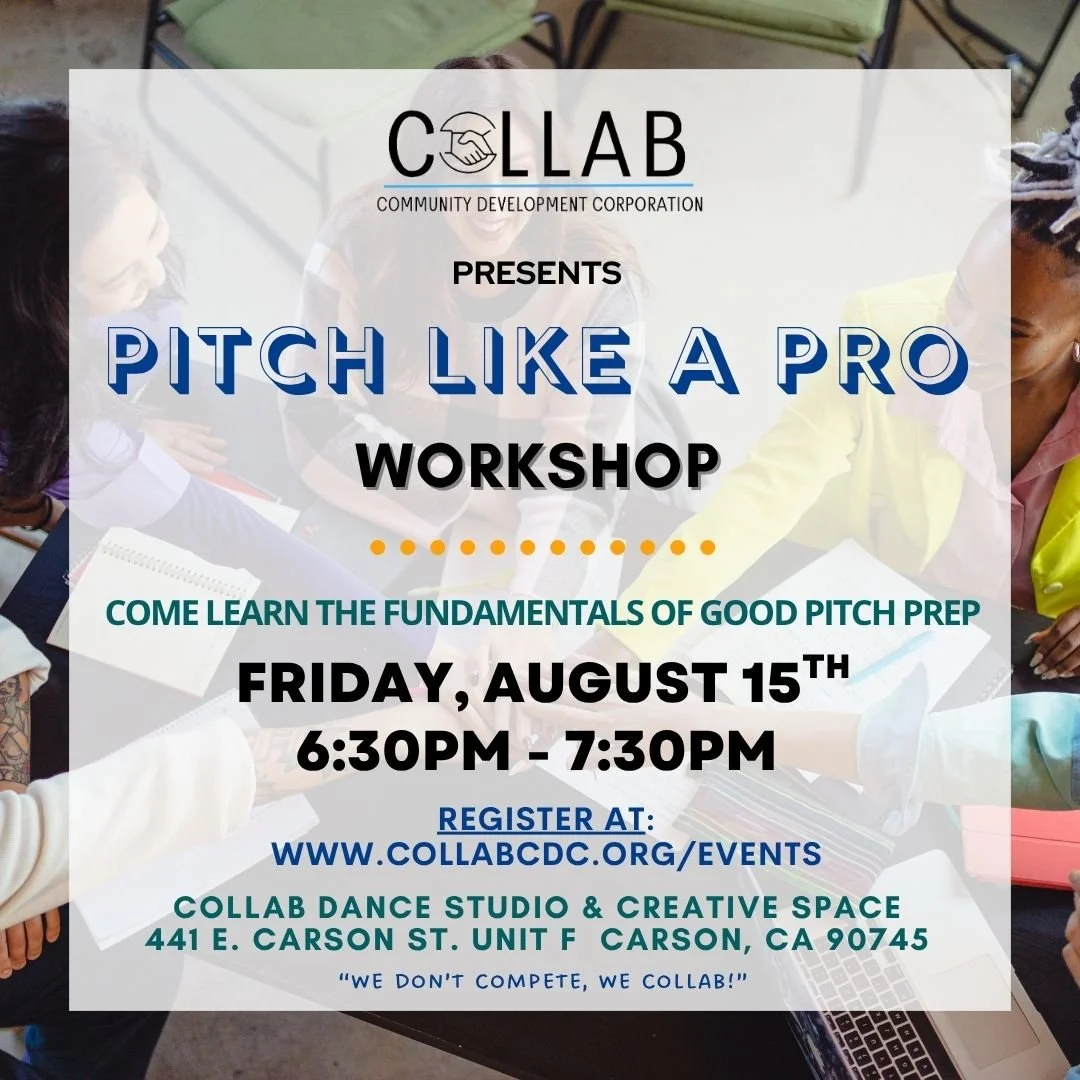 Oct 24 National Women’s Small Business Month Pitch Competition & Mixer Friday, October 24, 2025 6:30 PM 8:30 PM Bonne Vie at South Bay Galleria (map) Google Calendar ICS FREE AUDIENCE RSVP View Event → Oct 26 Malloween Sunday, October 26, 2025 6:00 PM 8:00 PM South Bay Pavillion Mall (map) Google Calendar ICS View Event → Oct 27 Tiny Tot Classes Monday, October 27, 2025 4:00 PM 7:00 PM Collab Creative Space (map) Google Calendar ICS Click to Regsiter View Event → Oct 30 Kids Performing Arts Classes Thursday, October 30, 2025 5:30 PM 7:30 PM Collab Creative Space (map) Google Calendar ICS Click to Regsiter View Event → Dec 7 Holiday Party & Silent Auction Sunday, December 7, 2025 4:00 PM 7:00 PM TBA (map) Google Calendar ICS Registration Opening Soon View Event → Oct 23 Kids Performing Arts Classes Thursday, October 23, 2025 5:30 PM 7:30 PM Collab Creative Space (map) Google Calendar ICS Click to Regsiter View Event → Oct 20 Tiny Tot Classes Monday, October 20, 2025 4:00 PM 5:00 PM Collab Creative Space (map) Google Calendar ICS Click to Regsiter View Event → Oct 16 Kids Performing Arts Classes Thursday, October 16, 2025 5:30 PM 6:30 PM Collab Creative Space (map) Google Calendar ICS Click to Regsiter View Event → Oct 13 Tiny Tot Classes Monday, October 13, 2025 4:00 PM 5:00 PM Collab Creative Space (map) Google Calendar ICS Click to Regsiter View Event → Oct 9 Kids Performing Arts Classes Thursday, October 9, 2025 5:30 PM 6:30 PM Collab Creative Space (map) Google Calendar ICS Click to Regsiter View Event → Oct 6 Tiny Tot Classes Monday, October 6, 2025 4:00 PM 7:00 PM Collab Creative Space (map) Google Calendar ICS Click to Regsiter View Event → Oct 2 Kids Performing Arts Classes Thursday, October 2, 2025 5:30 PM 7:30 PM Collab Creative Space (map) Google Calendar ICS Click to Regsiter View Event → Sep 30 Soulful Sunset Yoga Tuesday, September 30, 2025 7:00 PM 8:00 PM Collab Creative Space (map) Google Calendar ICS Click to Regsiter View Event → Sep 28 Power Hour Business Mixer Sunday, September 28, 2025 5:00 PM 7:00 PM Collab Creative Space (map) Google Calendar ICS Click to Register View Event → Sep 23 Soulful Sunset Yoga Tuesday, September 23, 2025 7:00 PM 8:00 PM Collab Creative Space (map) Google Calendar ICS Click to Regsiter View Event → Sep 19 Power of Capital Workshop presented by Chase Bank Friday, September 19, 2025 10:00 AM 11:00 AM Collab Creative Space (map) Google Calendar ICS Click to Regsiter View Event → Sep 16 Soulful Sunset Yoga Tuesday, September 16, 2025 7:00 PM 8:00 PM Collab Creative Space (map) Google Calendar ICS Click to Regsiter View Event → Sep 7 Grief Gathering Sunday, September 7, 2025 12:00 PM 4:00 PM COLLAB Dance Studio & Creative Space (map) Google Calendar ICS FREE RSVP View Event → Aug 29 The “Last” Twerk Shop Friday, August 29, 2025 7:00 PM 9:00 PM COLLAB Dance Studio & Creative Space (map) Google Calendar ICS Click to Register View Event → Aug 17 National Nonprofit Day Pitch Competition & Mixer Sunday, August 17, 2025 2:00 PM 4:30 PM COLLAB Dance Studio & Creative Space (map) Google Calendar ICS FREE AUDIENCE RSVP View Event → Aug 15 Pitch Like A Pro Practice Workshop Friday, August 15, 2025 6:30 PM 7:30 PM COLLAB Dance Studio & Creative Space (map) Google Calendar ICS FREE RSVP View Event → Jul 25 Free Food Distribution with 2hunned Org Friday, July 25, 2025 3:00 PM 5:00 PM COLLAB Dance Studio & Creative Space (map) Google Calendar ICS Drive or Walk Up View Event → Jul 18 Freaky Friday: Chair Dance Class Friday, July 18, 2025 7:00 PM 9:00 PM COLLAB Dance Studio & Creative Space (map) Google Calendar ICS Click to Register View Event → Jul 11 Free Food Distribution with 2hunned Friday, July 11, 2025 3:00 PM 5:00 PM COLLAB Dance Studio & Creative Space (map) Google Calendar ICS Drive or Walk Up View Event → Jul 11 Chase Financial Workshop: The Money Reset Friday, July 11, 2025 10:00 AM 12:00 PM COLLAB Dance Studio & Creative Space (map) Google Calendar ICS Click to Regsiter View Event → Jun 29 The Power Hour Business Mixer Sunday, June 29, 2025 5:00 PM 6:00 PM COLLAB Dance Studio & Creative Space (map) Google Calendar ICS Click to Register View Event → Jun 29 Sound Healing Sundays - Sound Bath Sunday, June 29, 2025 10:15 AM 11:15 AM COLLAB Dance Studio & Creative Space (map) Google Calendar ICS Click to Register View Event → Jun 21 1-Year Anniversary Showcase: High Expectations Academy of Performing Arts Saturday, June 21, 2025 4:00 PM 6:00 PM COLLAB Dance Studio & Creative Space (map) Google Calendar ICS View Event → Jun 13 “The Pitch” Competition & Mixer Friday, June 13, 2025 6:00 PM 8:00 PM COLLAB Dance Studio & Creative Space (map) Google Calendar ICS CLICK HERE TO APPLY TO PITCH BY 6/8 FREE AUDIENCE RSVP View Event → May 30 Speed Networking Mixer Friday, May 30, 2025 6:00 PM 9:00 PM COLLAB Dance Studio & Creative Space (map) Google Calendar ICS Click here for free RSVP View Event → May 28 National Senior Health & Fitness Day Wednesday, May 28, 2025 10:00 AM 12:00 PM COLLAB Dance Studio & Creative Space (map) Google Calendar ICS Click here for FREE RSVP View Event → May 24 Business Entity Formation 101 w/ Amesi & Associates Saturday, May 24, 2025 1:00 PM 3:00 PM COLLAB Dance Studio & Creative Space (map) Google Calendar ICS Click the Register View Event → May 16 Freaky Friday: Chair Dance Class Friday, May 16, 2025 7:00 PM 9:00 PM COLLAB Dance Studio & Creative Space (map) Google Calendar ICS Click to Register View Event → May 9 Ladies Night Heels Dance Class Friday, May 9, 2025 8:30 PM 9:30 PM COLLAB Dance Studio & Creative Space (map) Google Calendar ICS Click to Register View Event → May 3 Social Media Marketing Workshop Saturday, May 3, 2025 1:00 PM 3:00 PM COLLAB Dance Studio & Creative Space (map) Google Calendar ICS Click to Register View Event → Upcoming Events