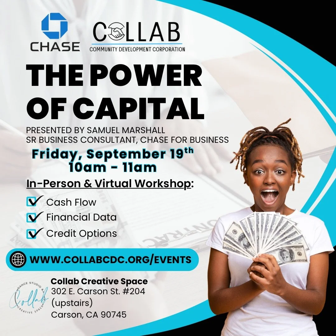 Sep 19 Power of Capital Workshop presented by Chase Bank Friday, September 19, 2025 10:00 AM 11:00 AM Collab Creative Space (map) Google Calendar ICS Click to Regsiter View Event →